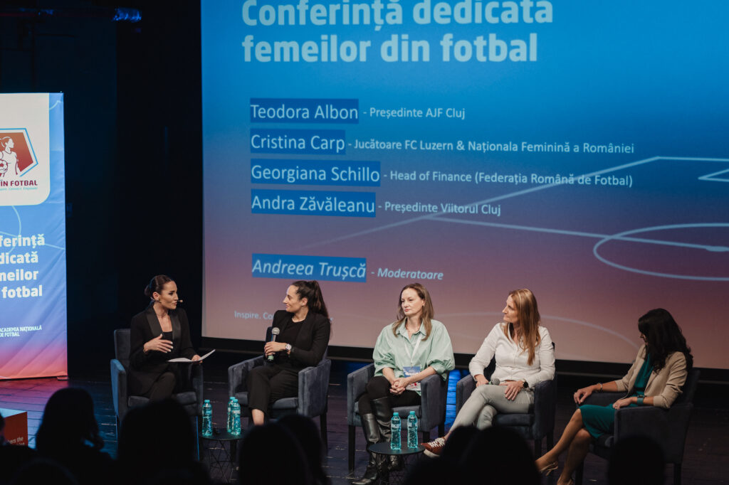 Andreea Trușcă a moderat un panel de discuții cu Teodora Albon (președinta AJF Cluj), Andra Zăvăleanu (președinta Viitorul Cluj), Georgiana Schillo (manager financiar FRF) și Cristina Carp (FC Luzern, Naționala Feminină).